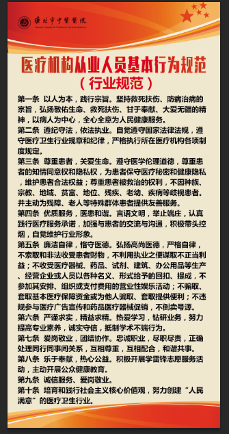 第四条 优质服务,医患和谐。言语文明,举止端庄,认真践行医疗服务承诺,加强与患者的交流与沟通,积极带头控烟,自觉维护行业形象。
